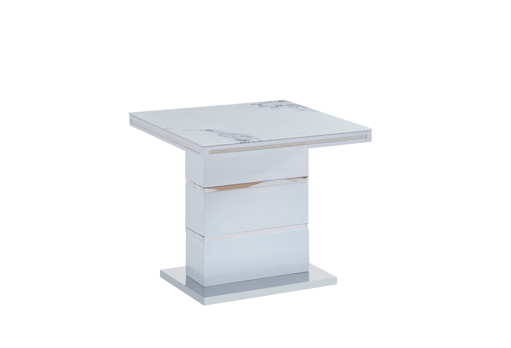 Elevate your living room with this contemporary end table, designed with a marble-look glossy finish for a touch of elegance. Available with gold or silver accents, it features a modern and compact design that blends style with functionality. Perfect as a centerpiece, this table adds a luxurious yet minimalist touch to any space.